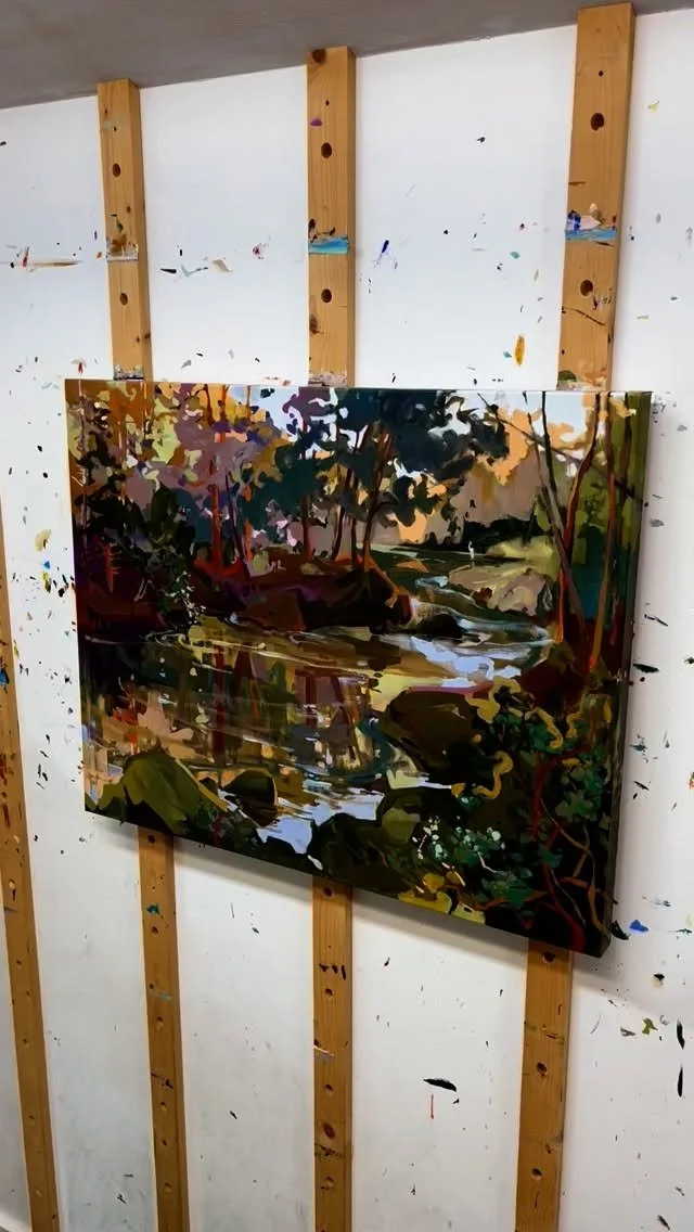 Jess Franks is known for vibrant acrylic paintings that dance the line between realistic and abstract. Her work relishes the influences of post-impressionism and fauvism, as seen in her fearless brushstrokes and color choices. Her favorite subjects to paint include Maine and New England, national parks, lake islands, layered mountains, and woodland streams. She’s a hiker who paints and a painter who hikes—they feed each other. When she’s hiking, she sees future paintings around every corner. When she finishes a series of paintings, she’s immediately researching her next hike.