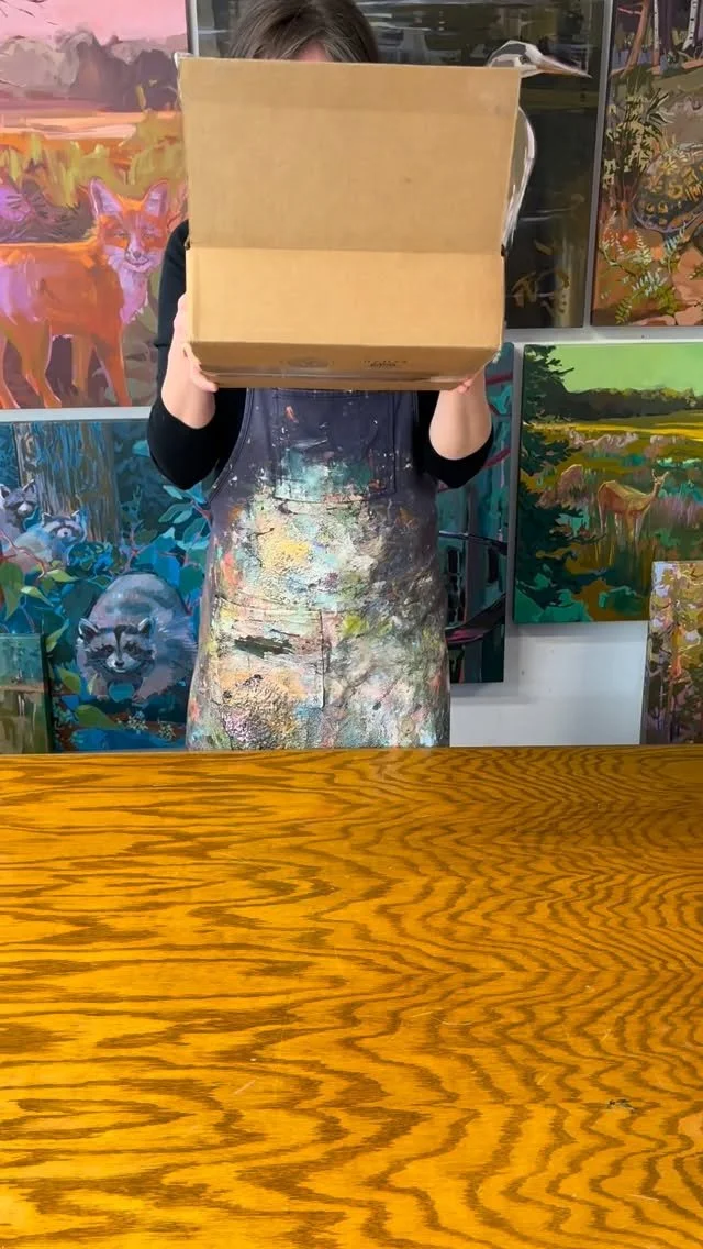 In 2020, Jess was able to invest in a separate studio building. Needing lots of wall space, light, ventilation, proximity to home and car, and room to store and ship, she decided to purchase a 12x24β shed from Kloter Farms. The shed arrived fully fabricated on a truck bed 6 weeks later (and should she ever need to move, the shed can go back on a truck and move with her). Then her contractor, VB Construction, outfitted the interior with insulation, roof venting, paneling, plywood, electric, and shelving, among other things. Once complete, Jess painted the interior, and decorated using mostly items she had already collected, resulting in a style she likes to call βHeirloom Chic.β Her great grandmotherβs paint palette looks right at home next to her grandfatherβs butcher block, which was repurposed into a desk by attaching it to an old bookcase and adding wheels. Her grandmaβs collection of owl figurines dot the room, as do items Jess inherited from her other grandma, such as a plump vintage kitty. Looking one direction, you get the clean white walls of a gallery, and looking the other, you feel like youβve been transported to a New England cabin. Itβs the best of both worlds. Click on an image below to open up a lightbox for scrolling through.